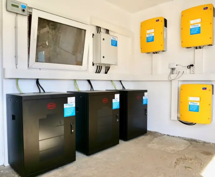 Ein Batteriespeicher von BYD mit einer Kapazität von 30 kWh sorgt in Kombination mit modernsten Wechselrichtern sowie einem Energiemanagementsystem von SMA dafür, dass der Landwirt den tagsüber erzeugten Strom am Abend für seine Melkmaschinen nutzen kann.